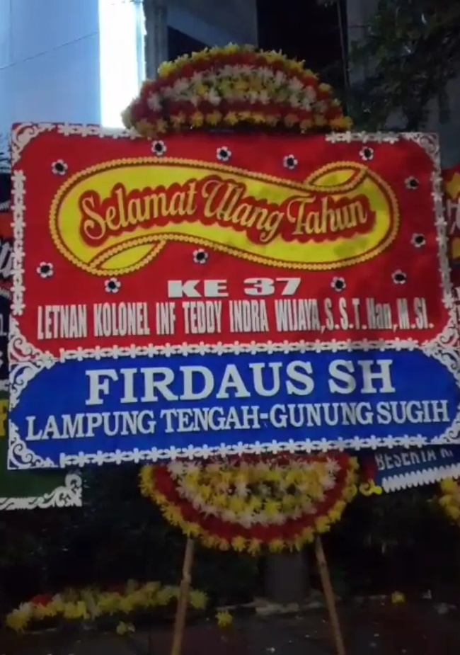 Ucapan selamat ultah disampaikan juga oleh Firdaus,S.H., Putra daerah dari Gunung Sugih Kabupaten Lampung Tengah Provinsi Lampung melalui karangan bunga yang terpampang di deretan karangan bunga mengucapkan Selamat Ulang Tahun ke-37 kepada Letkol Teddy Indra Wijaya, M.Si.
